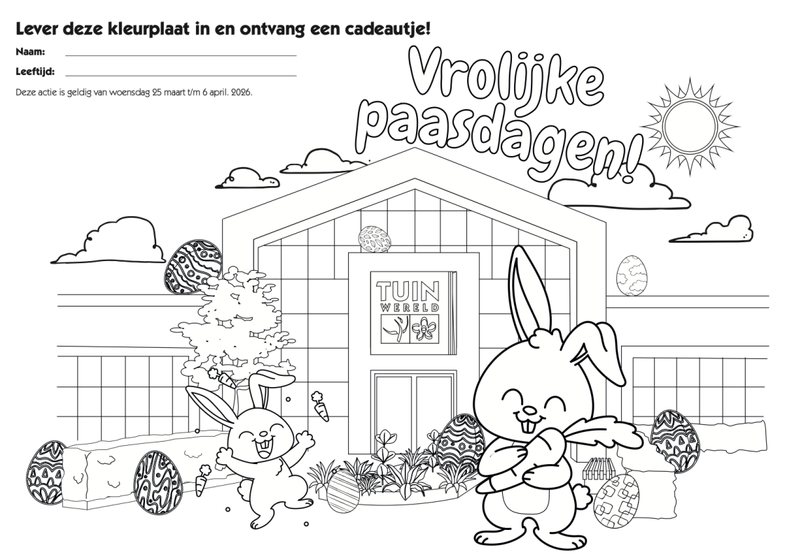 Vanaf woensdag 25 maart 2026 kunnen kids een leuke kleurplaat downloaden of ophalen in de winkel. Laat de creativiteit de vrije loop, kleur ‘m zo mooi mogelijk in en lever ‘m weer bij ons in.